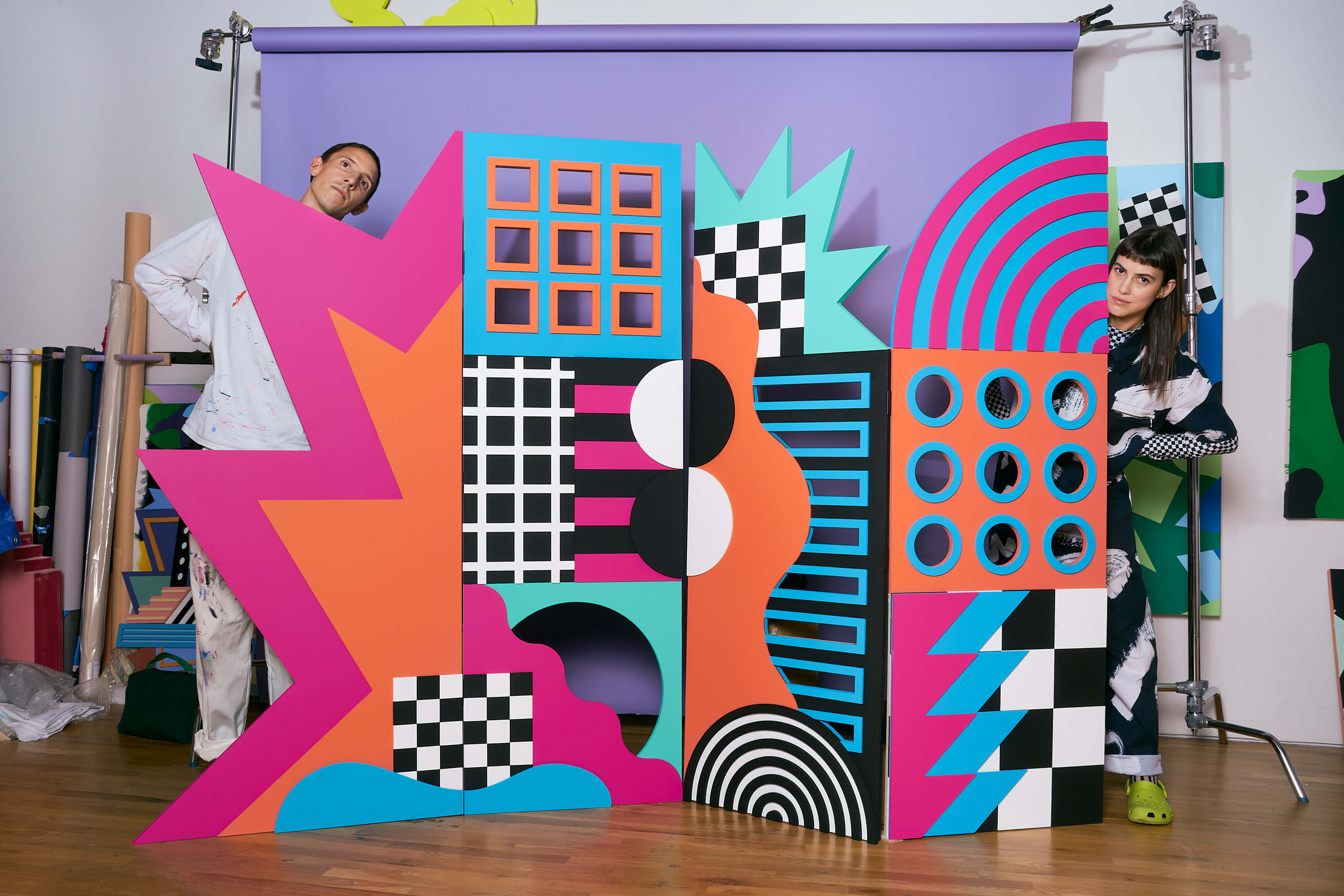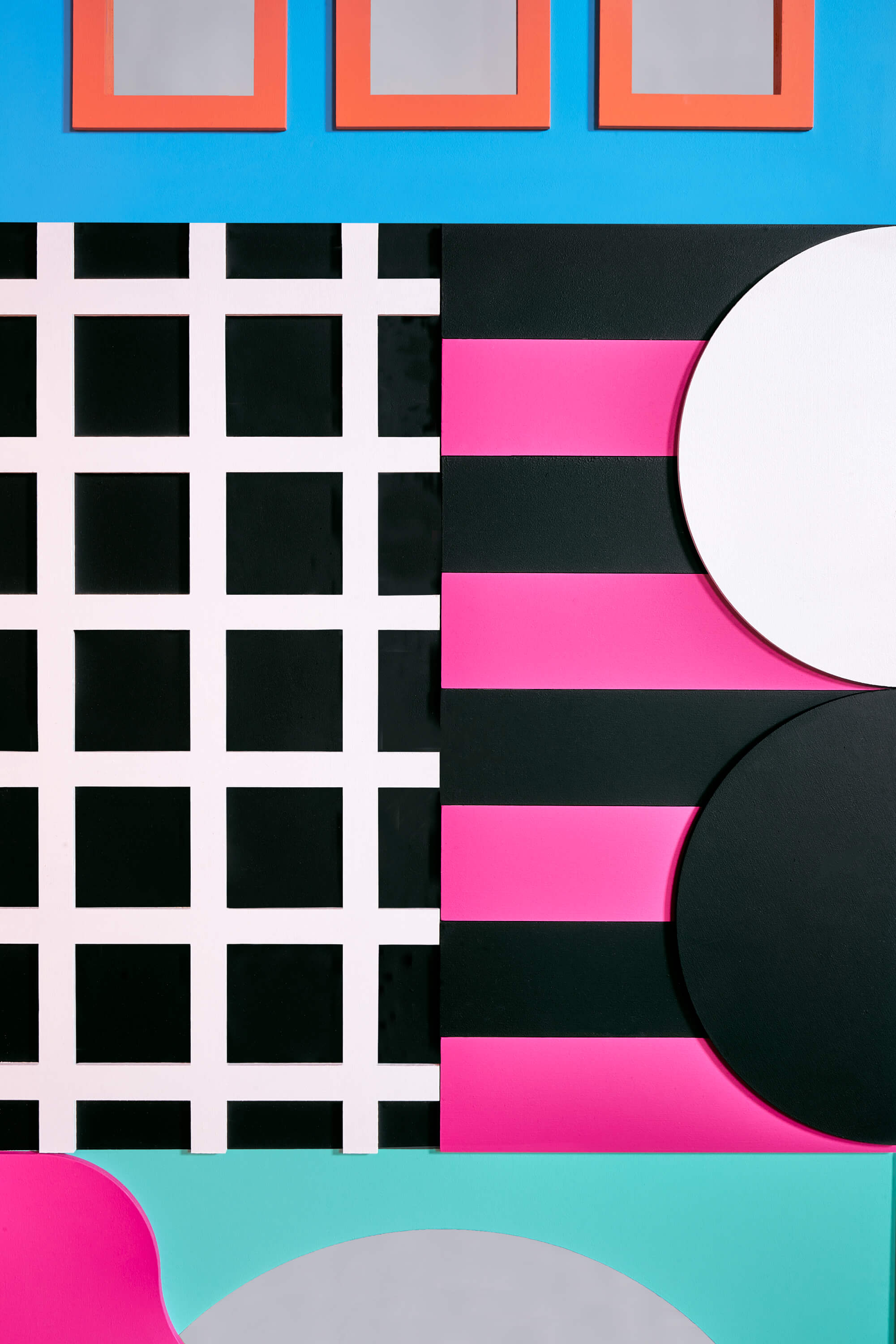 Initially beginning as a video project about the history of Memphis to inspire those who were discovering this movement in design history for the first time, this opportunity would also feature our studio and how we were personally inspired by Sottsass and his friends and so we wanted to use the vibrant energy of the movement as inspiration for us to create a piece that would be included within the video. We fashioned a room divider and several stools to supplement the space, all painted in vibrant melon, fuchsia, mint, and cerulean blue. We worked closely with the team at Adobe Create to make a video that could help inspire those who were discovering this influential moment in design history for the first time and to share how fun and enjoyable design history can truly be. In addition, we created a set of free design assets that would help encourage designers to break out of their comfort zones and work with a reestablished toolkit to design a piece of their own.